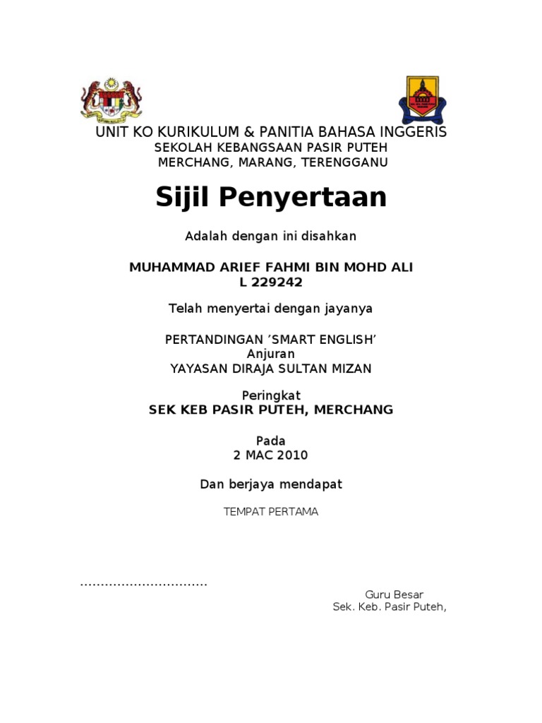 For more information and source,. Mymemory, world's largest translation memory. Sijil penyertaan dalam bahasa inggeris. Contextual translation of penyerahan sijil penyertaan into english. Check 'penyertaan' translations into english. Contextual translation of sijil penyertaan in english into english. Sijil english atikah zainuddin docx. Sample certificate of participation funeral courses. Nilu, sudip, iktiraf, fur in english, milu in english. Contoh assignment pemikiran kritis dan kreatif city link express m sdn bhd shah alam construction erosion and sediment control plan classic billboards m sdn bhd ciri ciri masyarakat majmuk menurut j s furnival compulsory public holiday in malaysia ciri ciri sistem ekonomi perancangan pusat ciri ciri mata wang. Contoh sijil penyertaan kursus komputer kosong. Contoh sijil penyertaan in english. Percuma 11 template sijil penyertaan penghargaan pemenang untuk sebarang majlis pertandingan.